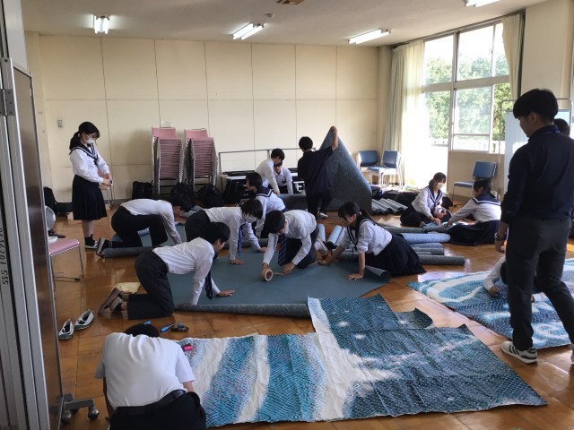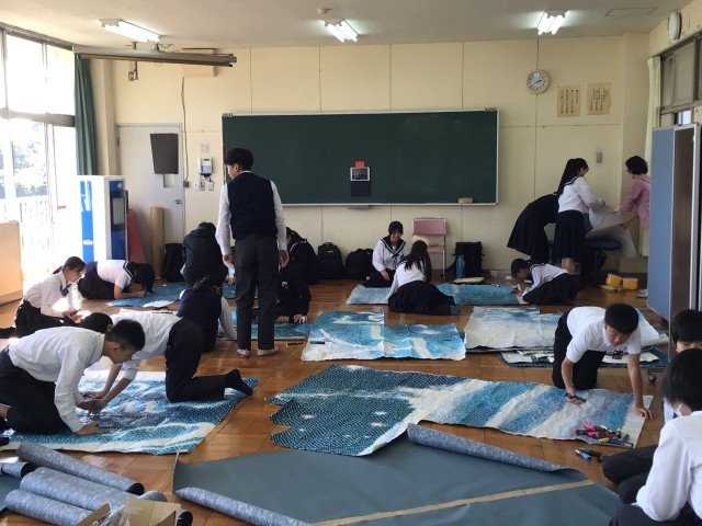 一人一人が塗ったモザイクアートを全体で貼り合わせています。できあがりが楽しみです!