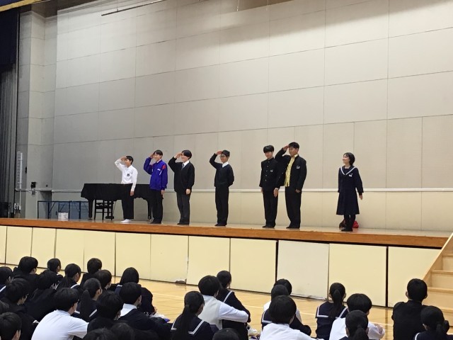 生徒会役員から、冬の制服の着方について劇を交えながら話がありました。特に今年は新しい制服が採用されたことに伴い、セーターなどの着こなし方がポイントですよ。先生からの講話もありました。