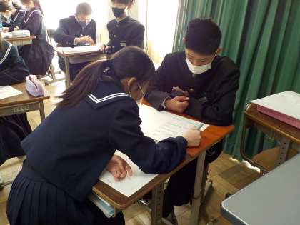 1年生の総合の授業の様子です。知多市の避難所運営マニュアルを見ながら,自分たち中学生でもできることをピックアップしたり,他にできそうなことは無いか考えて追加したりしています。今後は,実際の避難所生活を想定した実践を行う予定です!