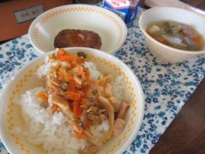 毎月19日は「食育の日」です。今日の献立は、白飯、牛乳、ふきとたけのこごはんの具、ハンバーグ和風ソースかけ、けんちん汁です。ふきやたけのこは、春野菜として旬の食材です。ふきは、愛知県が全国1位の生産量を誇り、近隣市町でもふきのハウスを多く見かけます。今日の給食は、テストで疲れた体に一層おいしく感じられたかもしれませんね。