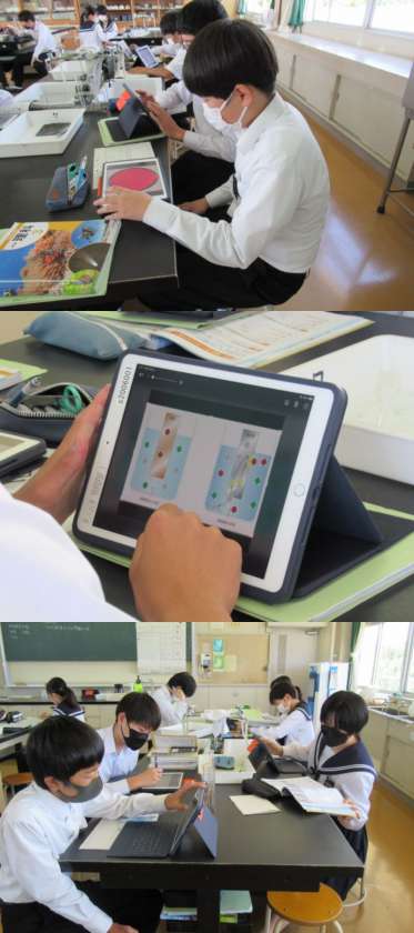 単元「電池とイオン」、実験結果から電子やイオンの動きについてイオンのモデルを使って表現する活動を行っています。タブレットが効果的に活用される学習内容です。