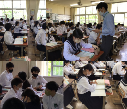 unit2では、接続詞を学習します。今日はthatです。新しい単語をテンポよく発音練習したり、近くの友達と話し合ったりして授業が展開しています。