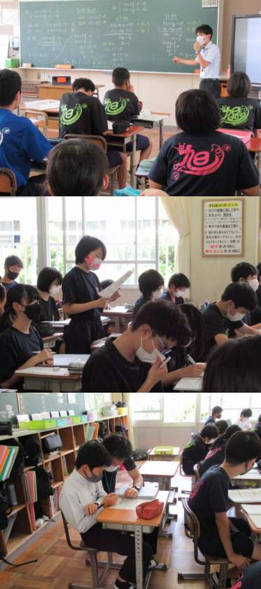 連立方程式の学習です。加減法で解く練習をしているところです。数学も少しずつ複雑になってきますが、二人の教師で学習を支援し、できるだけ生徒に分かりやすく伝わる丁寧な板書を心がけています。困ったときは、ぜひ、先生に声をかけましょうね。