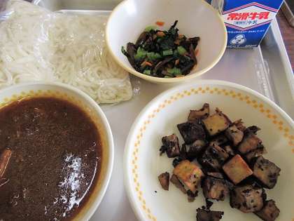 本日の献立:ソフトめん、牛乳、肉みそかけ、大学いも、野菜とくきわかめのあえもの