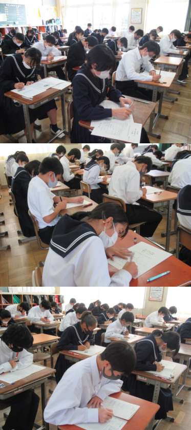 6時間目は、全学年で5科以外の確認テストです。一日中そわそわしていた生徒もいるかもしれません。2、3年生は明日まで続きます。最後まで粘りましょう。