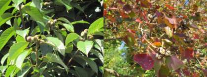 テニスコート付近を歩いていたら、頭に何かがあたりました。しばらくすると、コツンとまた地面に落ちる音。その正体はドングリでした。澄み切った秋空にドングリとナンキンハゼの白い実が映えます。