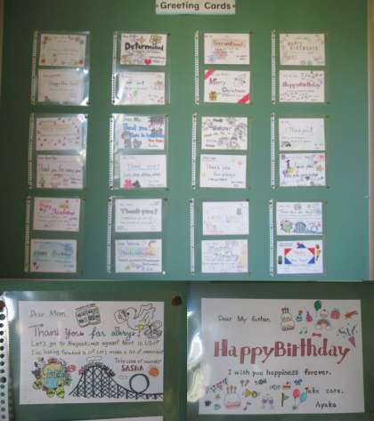 いつも楽しみにしている英語科の掲示板。先日までハロウィンでしたが、今日は誕生日、クリスマスなどのオリジナルのGreeting Cardsが掲示されていました。1年生の作品だそうです。心が温まります。