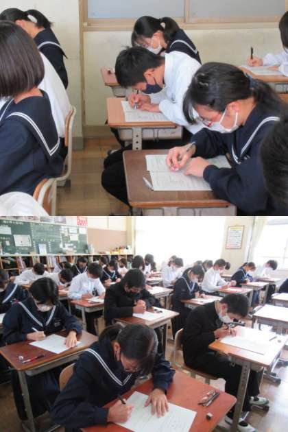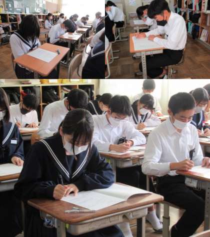 2時間目、2年生は社会科のテストです。テスト配付から約5分間、表紙の注意事項を読みながら開始を待ちます。チャイムと同時に記名してスタートです。がんばれ!