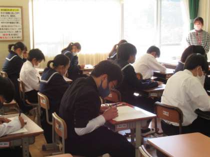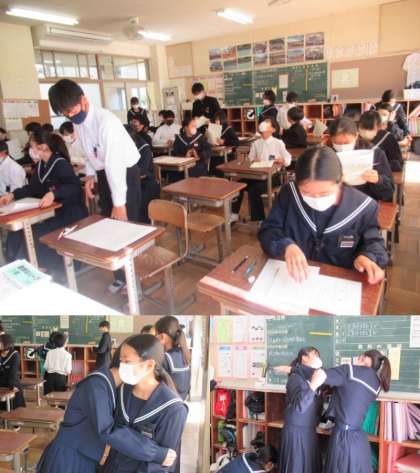 3時間目、1年生は理科のテストです。まもなく終了時間ですが、最後まで粘る姿が見られます。終了後の安堵の表情がいいですね。明日もがんばろう!