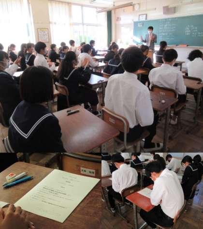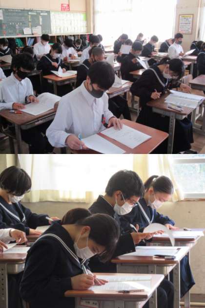 「机上、手のひら、落書きやメモはありませんか」監督の先生の声が掛かります。お互いが気持ちよくテストに向き合うための準備です。1年生もテスト開始です。