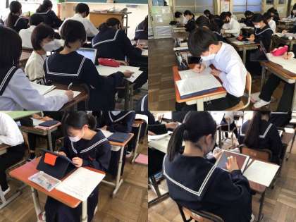 My Heroの紹介文を書いています。家族や著名人等を紹介している生徒が多いように感じますが、先輩の紹介を書いている生徒がいました。きっとすてきな先輩なんでしょうね。