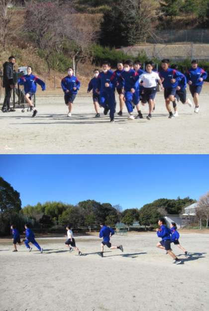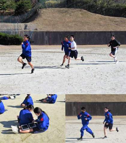 インターバルトレーニング中。中距離と短い休息を繰り返し行い、持久力を高めています。走法も確認しながら走っていました。ゴールすると転がり込んで天を仰ぐ姿も。