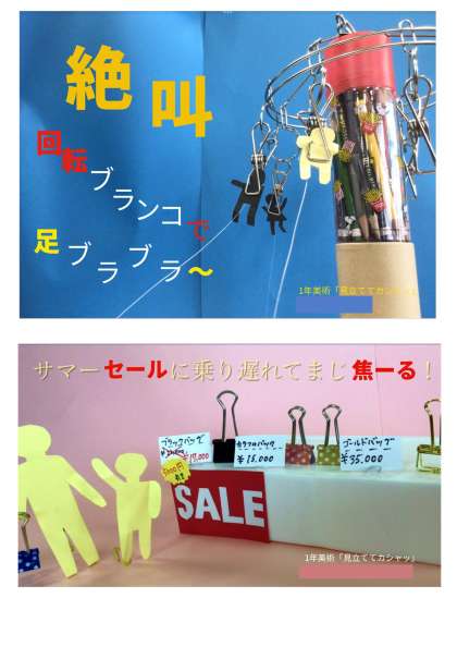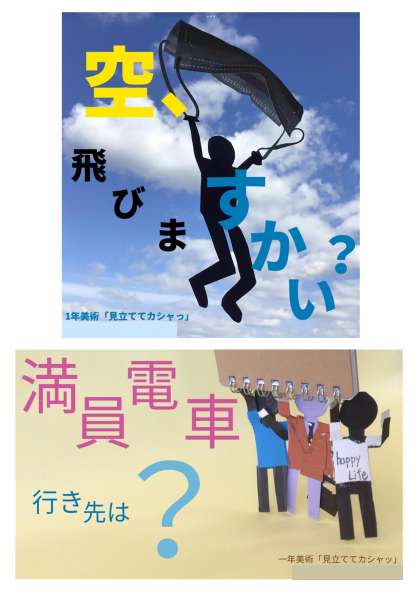 1年生の美術では、作家の田中達也さんの「見立ての世界」にちなんで、「見立ててカシャッ」という授業を行いました。身の回りのものを「別のもの」に見立てて写真を撮影し、キャッチコピーを配置してポスターとして仕上げています。生徒たちの作品の一部を紹介します。