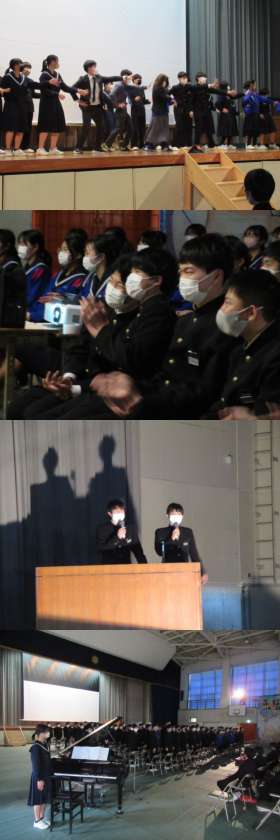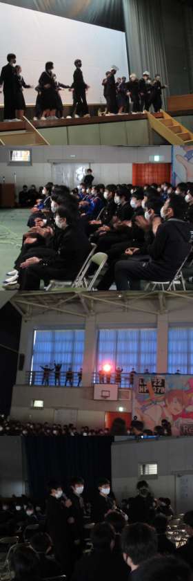 サプライズで1・2年生と教職員がダンスを披露。授業後に練習したのですが、やはり難しかったです、、、3年生の各学級からも、思わず笑いが起こるようなお返しや後輩たちへの呼びかけががありました。