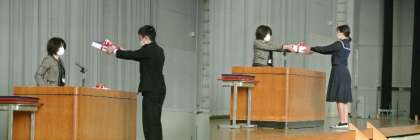 卒業記念品として知多市教育委員会から証書ホルダー、PTAから胸花が代表生徒に授与されました。