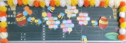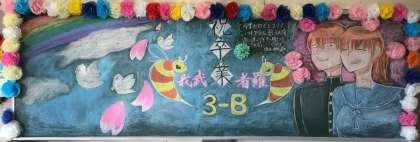 背面黒板には、2年生の生徒たちからのメッセージが飾られています。