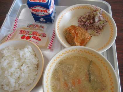 本日の献立:白飯、牛乳、けんちんしのだのたれかけ、キャベツのゆかりあえ、呉汁、お米のいちごクレープ