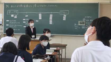1年B組で教育実習生の道徳の研究授業が行われました。緊張している実習生と共に授業を作り上げようと、一生懸命に自分の意見を発言している生徒の姿を見ることができました。