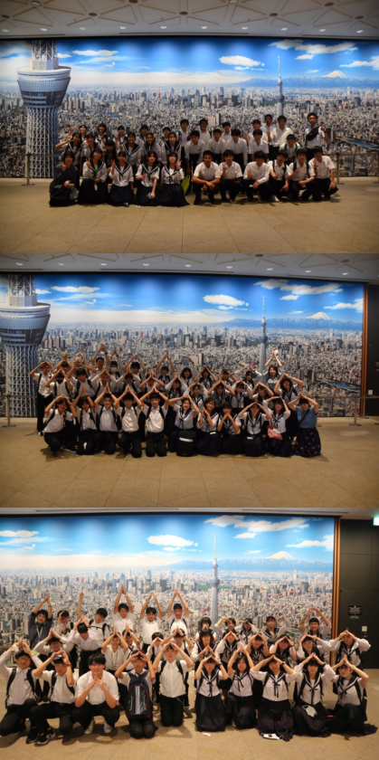 スカイツリー展望台へ。テレビ番組の撮影を行なっていたため、すばらしい眺望とともに、そちらも楽しめました。