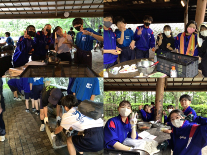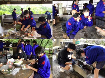 雨にも負けずバーベキュー!五平餅は炊かれたご飯が配られ、潰すところから始まります。今日は炭に火を着けるので、やや難航している班もあります。