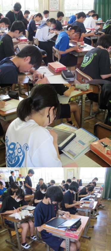 俳句の学習をしています。タブレットをノートのように使いこなしている生徒たちの姿を見て、評議員さんからは、タブレット導入時と比べてさらに上手に活用しているとの感想をいただきました。