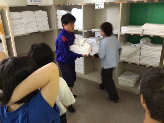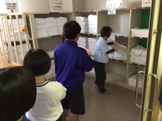 さっそくシーツ係が活躍です。上手にベッドメーキングできるかな?
