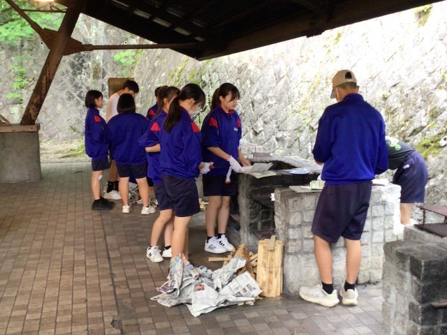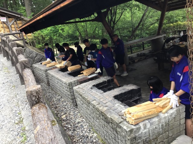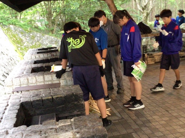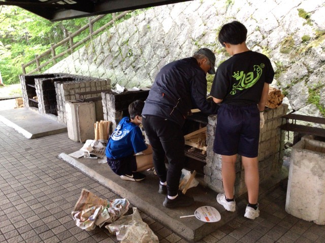 カレーライス作りが始まりました。まずは、かまどに火が付くかが問題ですね。施設の方に教えてもらった班はラッキーだったかも⁈