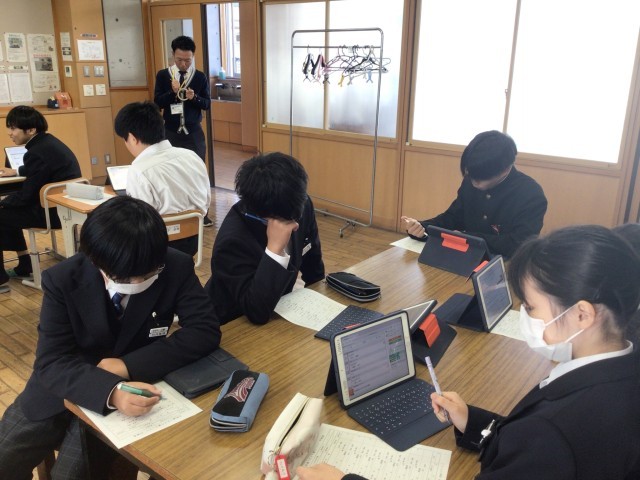 合同自活の前半では、生徒総会のためのアンケートを行いました。自分の学校生活を振り返りながら、2学期のよい終わりに向けて、環境整備や時間の意識を再確認していきました。