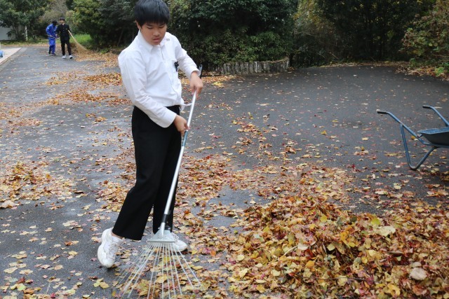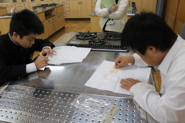 家庭科の授業では、さしこの布巾を作成しています。真剣なまなざしで運針をしています。