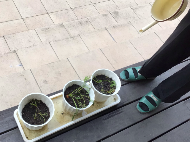 先週間引いた「こびと人参」は、鉢に移って教室横のベランダにやって来ました。