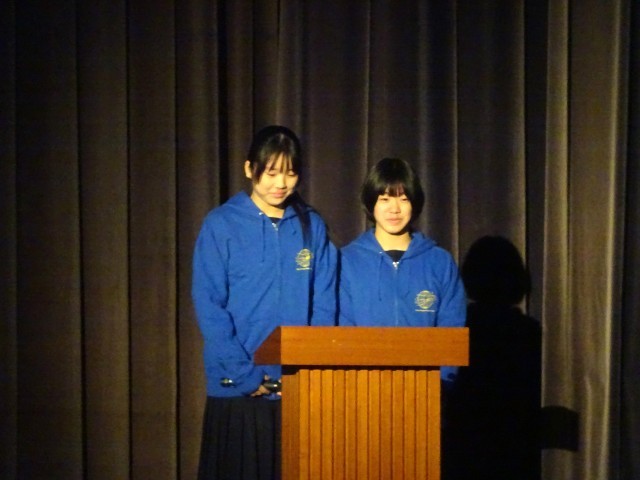 海外派遣に参加した二人の生徒が、クイズを交えながら8日間のニュージーランドでの体験を話してくれました。