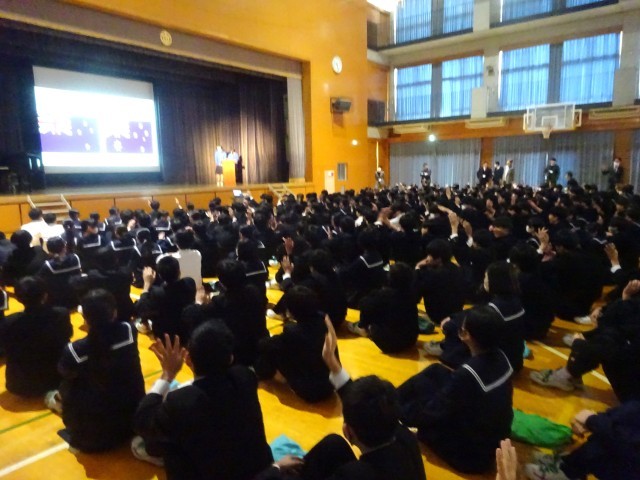 始業式の後、海外派遣生徒による報告会を行いました。