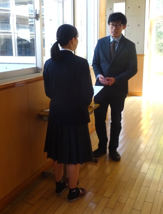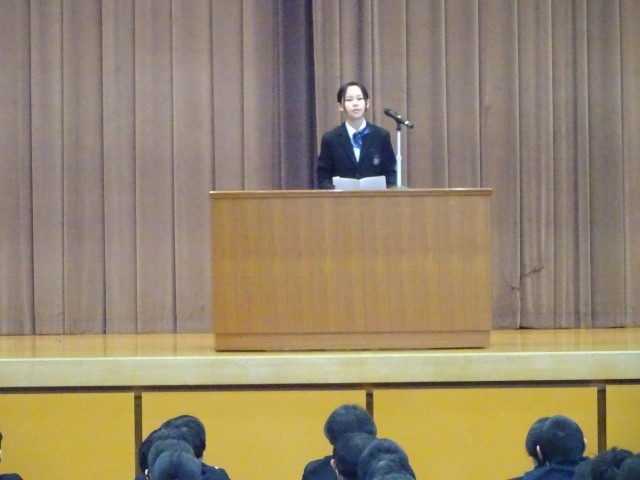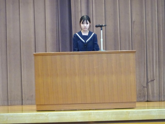 修了式の後、1、2年生の代表生徒が、それぞれ学年目標「努力」「応援される学年」を目指して取り組んできたことを発表しました。