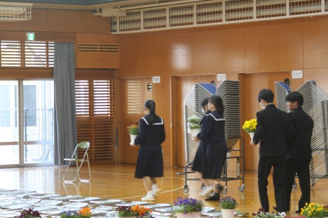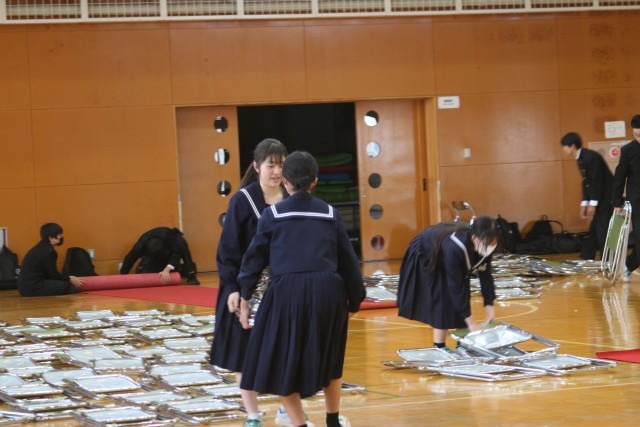 入学式後に,3年生全員で会場の後片付けを行いました。3年生のメリハリのある行動のおかげで,後片付けもすぐに終わることができました。今後も知多中学校の最高学年として1・2年生のお手本となる姿を見せてください。