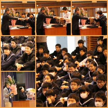 (おまけで、先生たちの知多中校区バレーボール大会優勝の報告も…ずっしりと重い優勝カップと鉢植えのお花をいただきました)