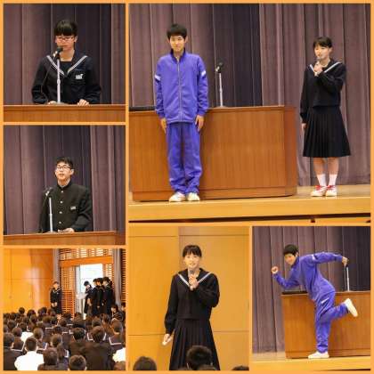 後半は、図書委員長より読書週間の取組について、福祉委員長より赤い羽根募金のお礼があり、最後に新しいジャージのお披露目をしました。(照れくさそうにポーズをとるのですが、笑っていいのかいけないのか微妙な空気でした)