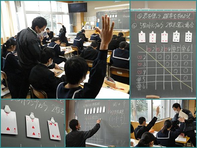 トランプのカードを黒板に提示して、わかりやすく。