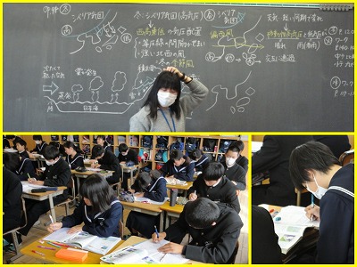 地図に雲の動きを書き込みながら気団の学習をしています。