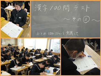 黒板にあるとおり、とめ、はね、はらいに注意しながら時間いっぱいテストを受けています。