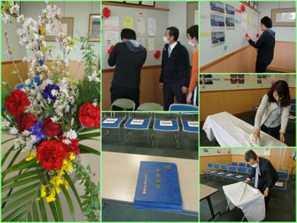 祝電を貼りだす、白布にアイロンをかける、花瓶に花を生ける、応接セットや会議用のテーブルを外に出す、会場のレイアウトをする・・・みんなで協力してあっという間に完成!