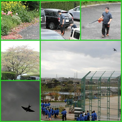 嵐のあと片づけを、ブロア片手に校務主任がせっせと行っています。