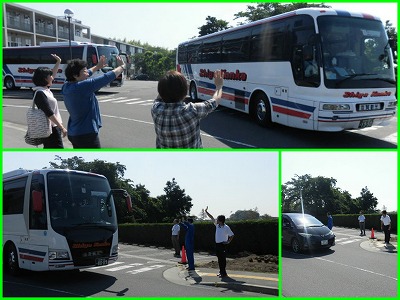 職員が見送る中、次々とバスが発車します。