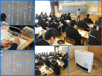 外は風が強いけれども、普通教室にはガスファンヒーターがフル稼働しています。