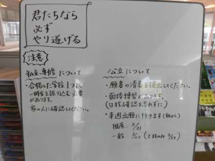 進路黒板の中身は・・・来週の公立出願に向けて準備が進む。