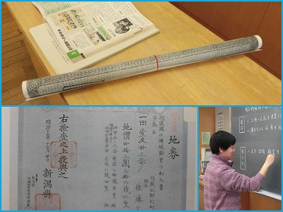 「たぶん地券じゃないでしょうか」と資料集の写真を指さし小声でつぶやく生徒。