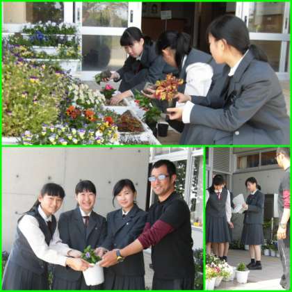半田農業高等学校1年生の3人娘が、持参した花の苗を植えてくれました。