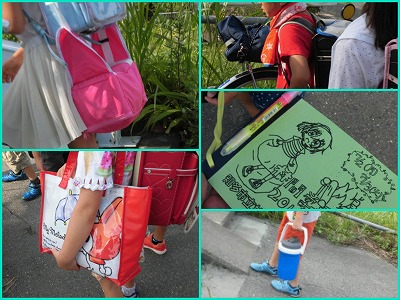 大きな水筒をぶら下げる子、首にタオルを巻いている子、しおりをぶら下げている子…
