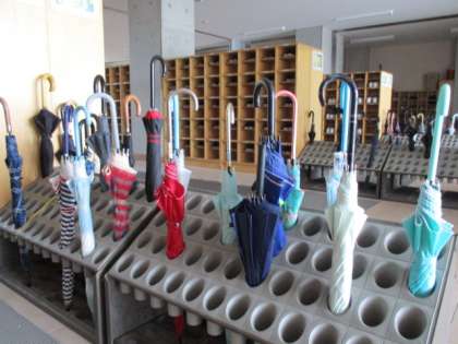 昇降口には色とりどりの傘が並んでいます。