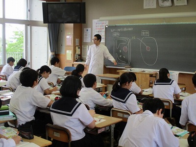 白衣の先生は、長袖羽織っているだけにエアコン使いたいところだけど、開けてましたね。黒板に細胞のイラストを大きく描いていました。