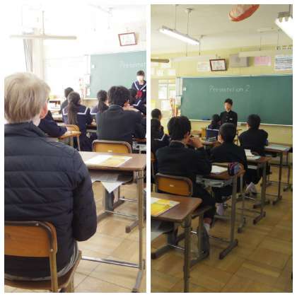 presentation 公開日 2019/02/04 更新日 2019/02/04 校長室から 今週は、ALTのヨウニ先生が英語に入ります。 一人一人が”presentation”スピーチをして、ヨウニ先生の質問に答えます。 緊張するなあ。 1年生は、マスクの生徒が多いですが、インフルエンザ罹患者は数名です。